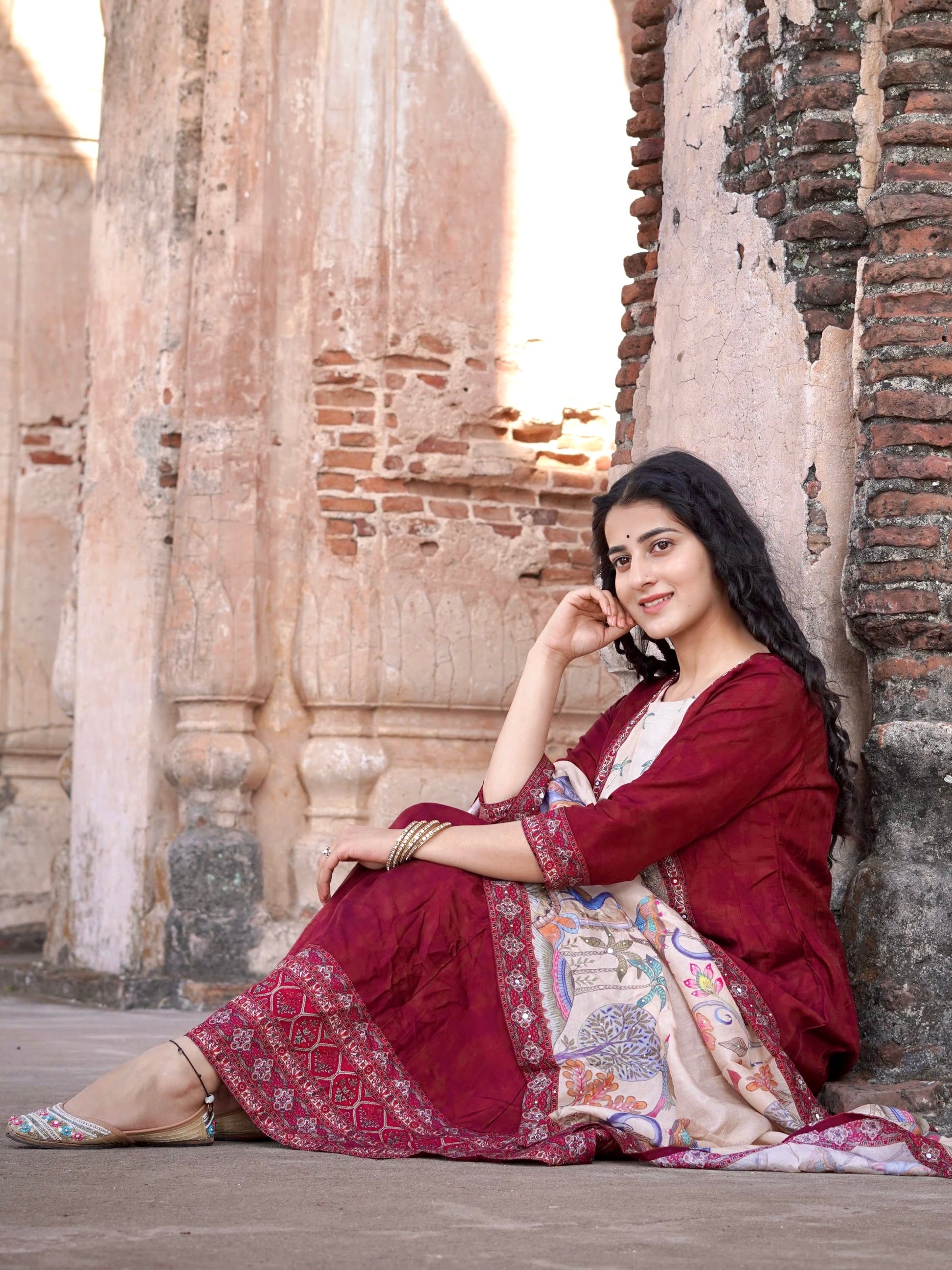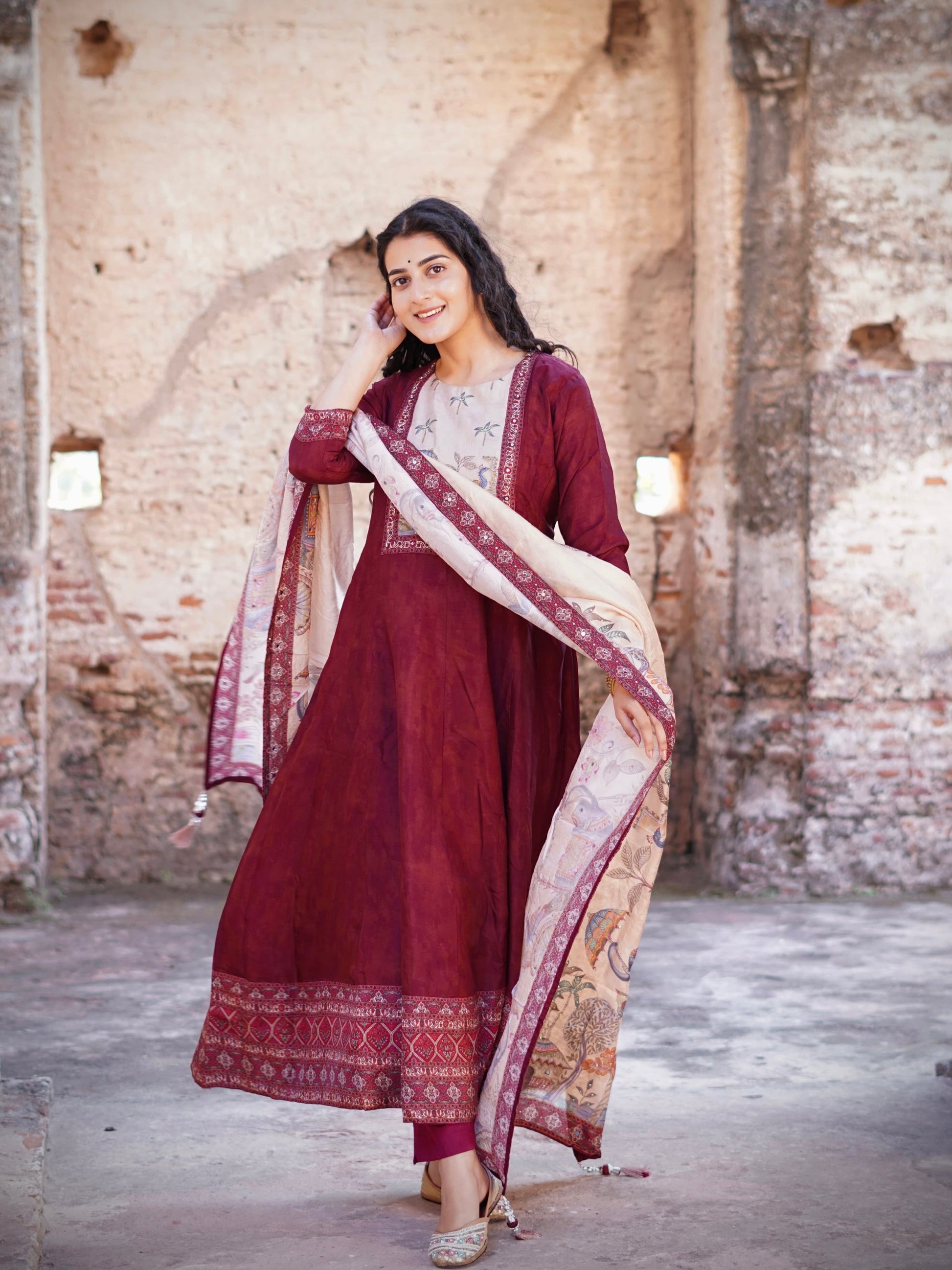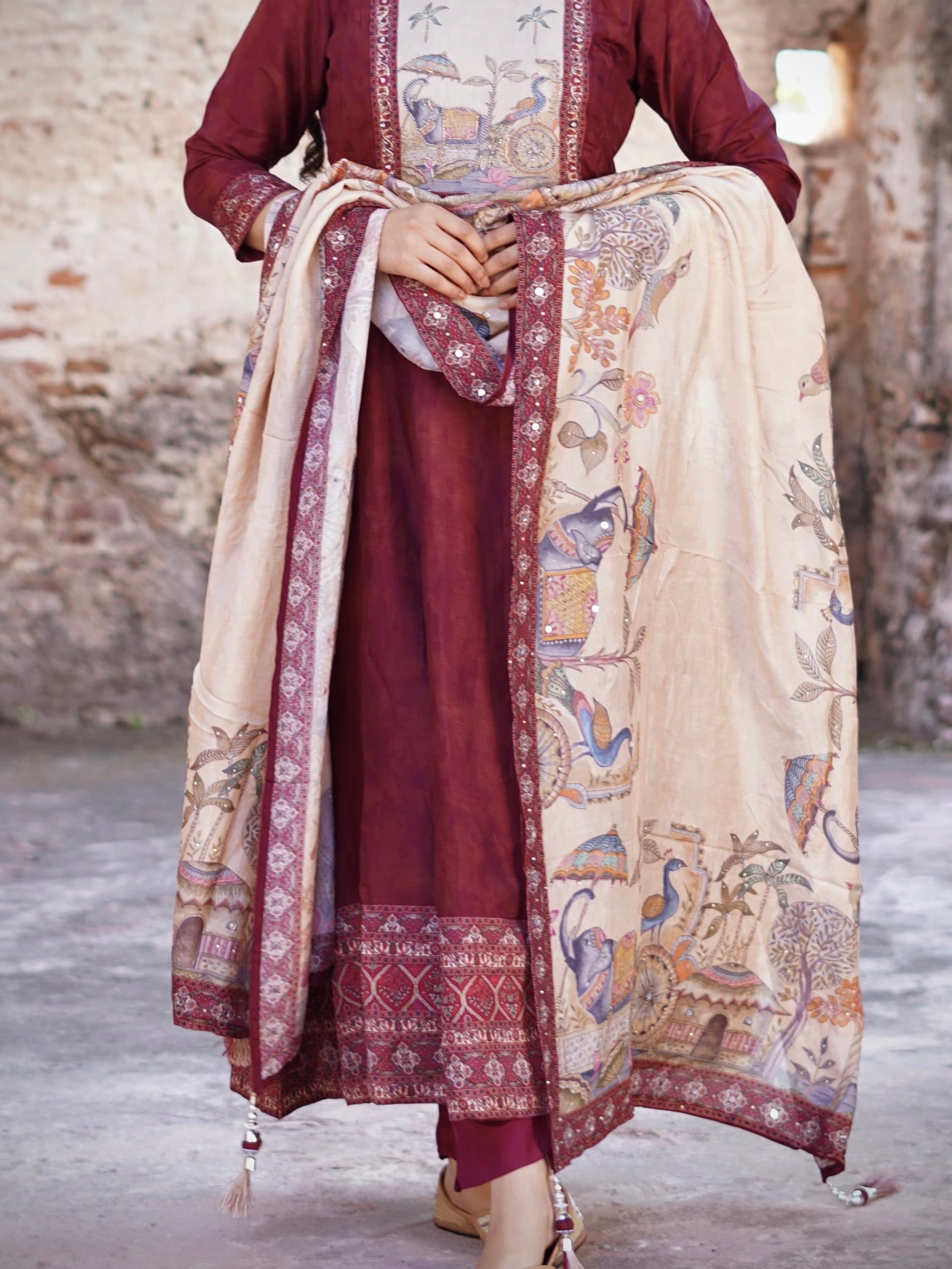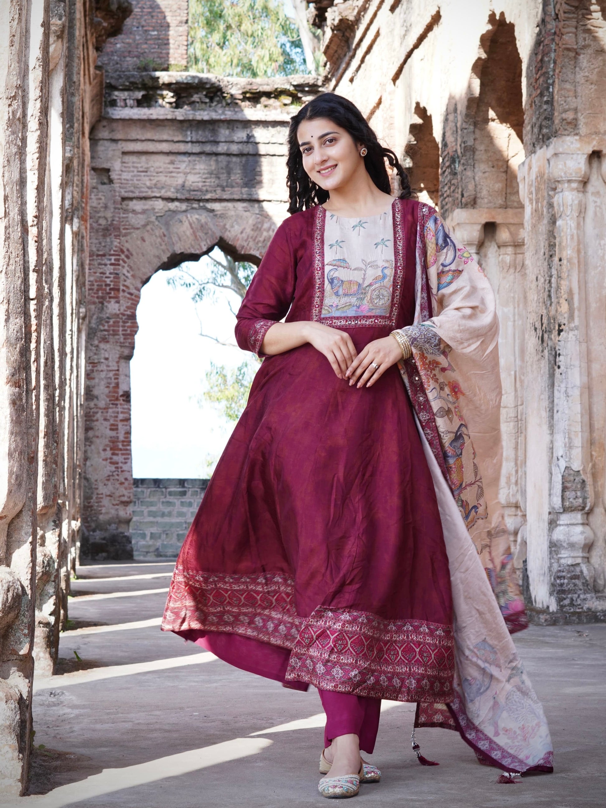 This beautiful combo features sophesticated hand embroidered silk dupatta in contrast with a rich soft pure dola silk anarkali style dress and a matching pant.