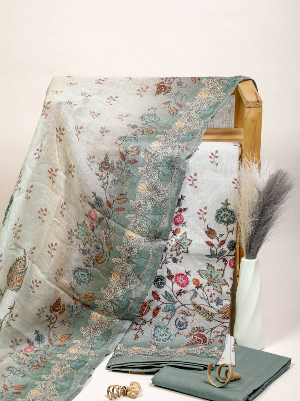 Purely Linen Rich Embroidered Light Grey Unstitched Suit Set