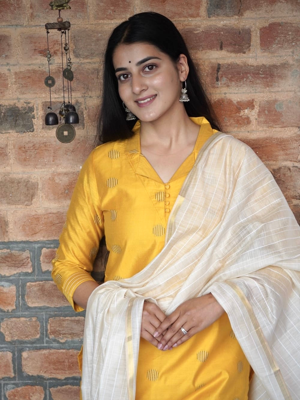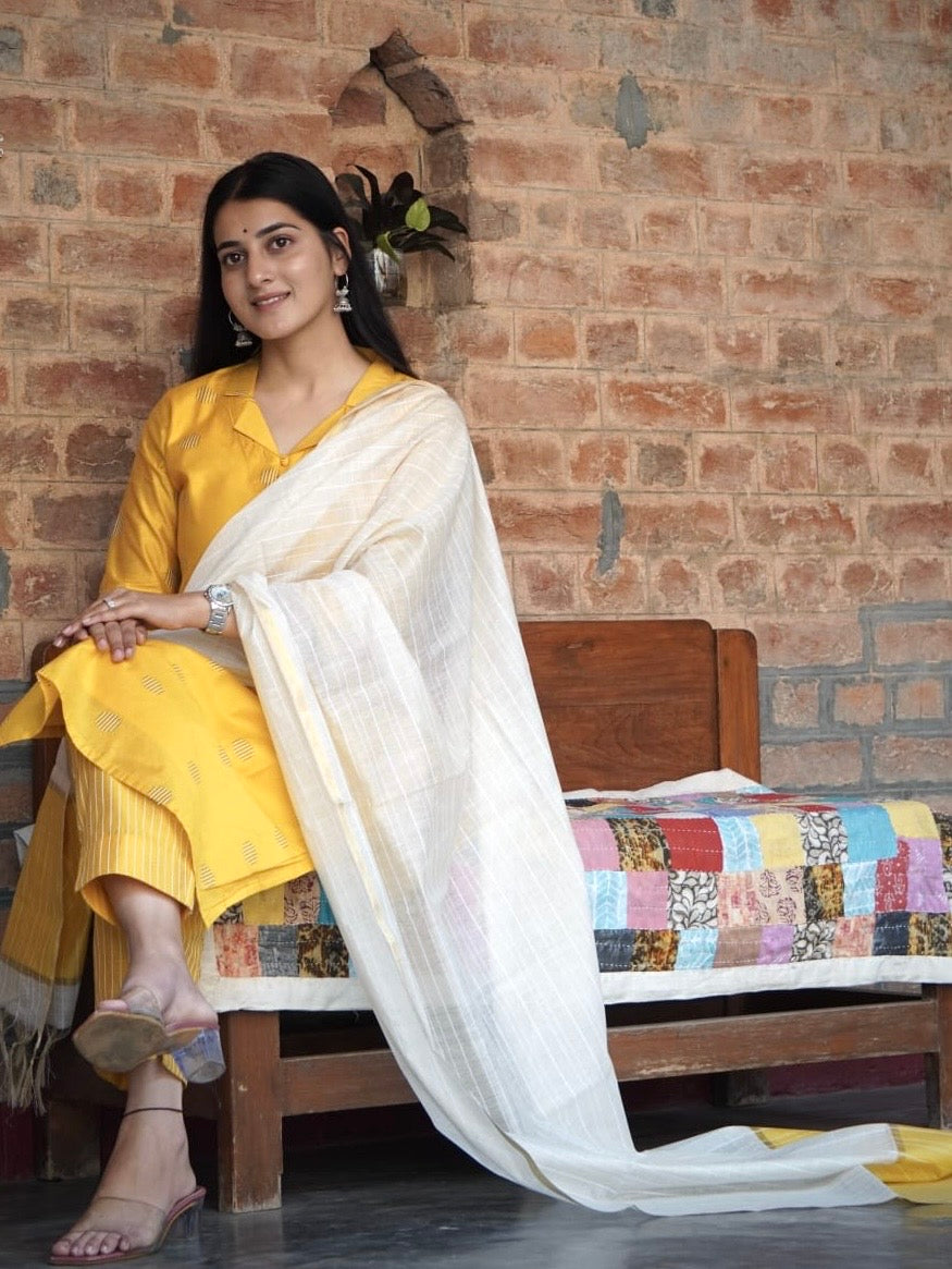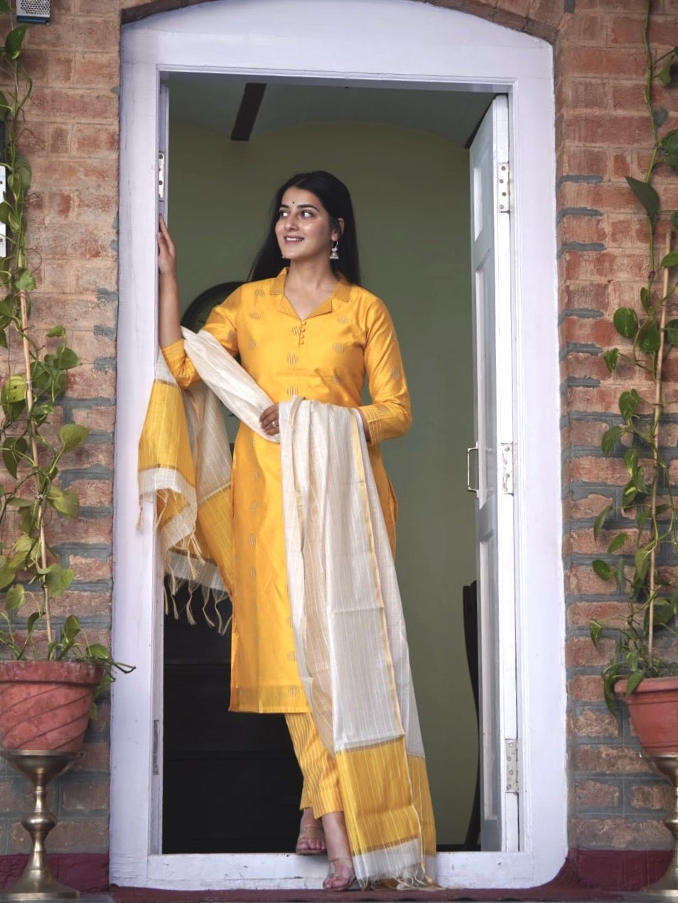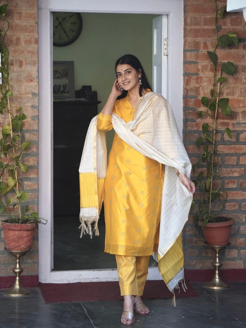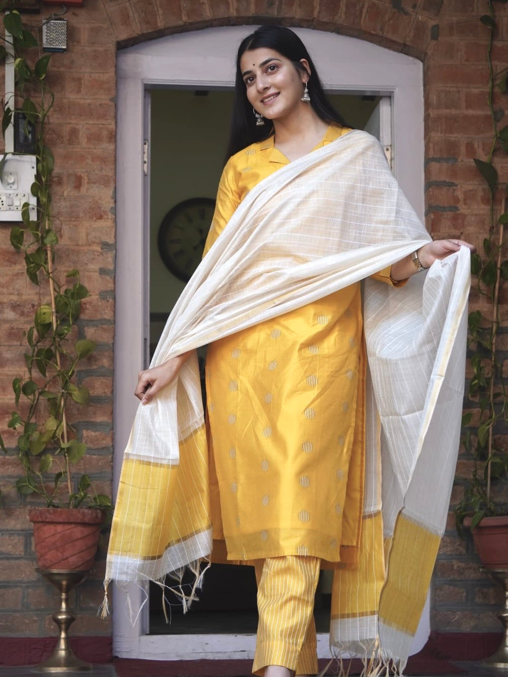 Upgrade your workwear wardrobe with the Sun & Sand Elegance Cotton Silk Kurta Set, a perfect blend of sophistication and comfort. Crafted from pure cotton-silk fabric, the kurta features a unique butti weave with soft zari threads, adding a subtle shimmer to its refined look. The collared neckline enhances its structured elegance, while the earthy chickoo and yellow tones create a timeless appeal. Paired with a matching cotton-silk dupatta, this pure cotton kurta set for women is ideal for professional settings and formal occasions.