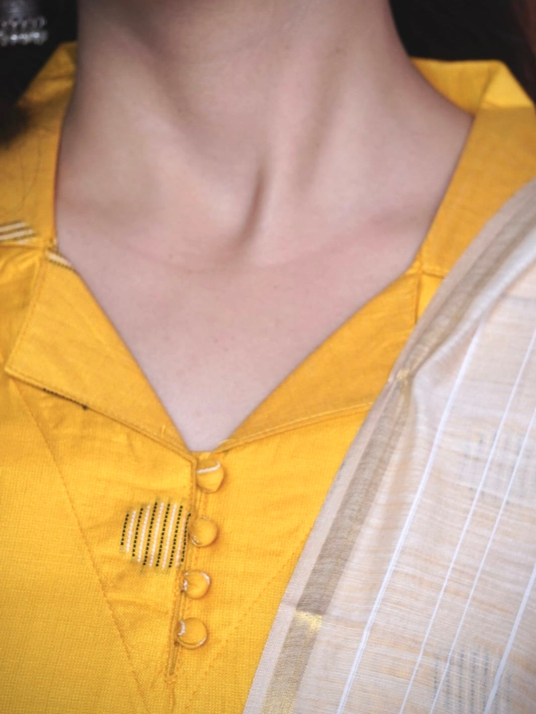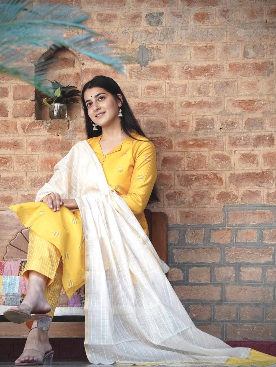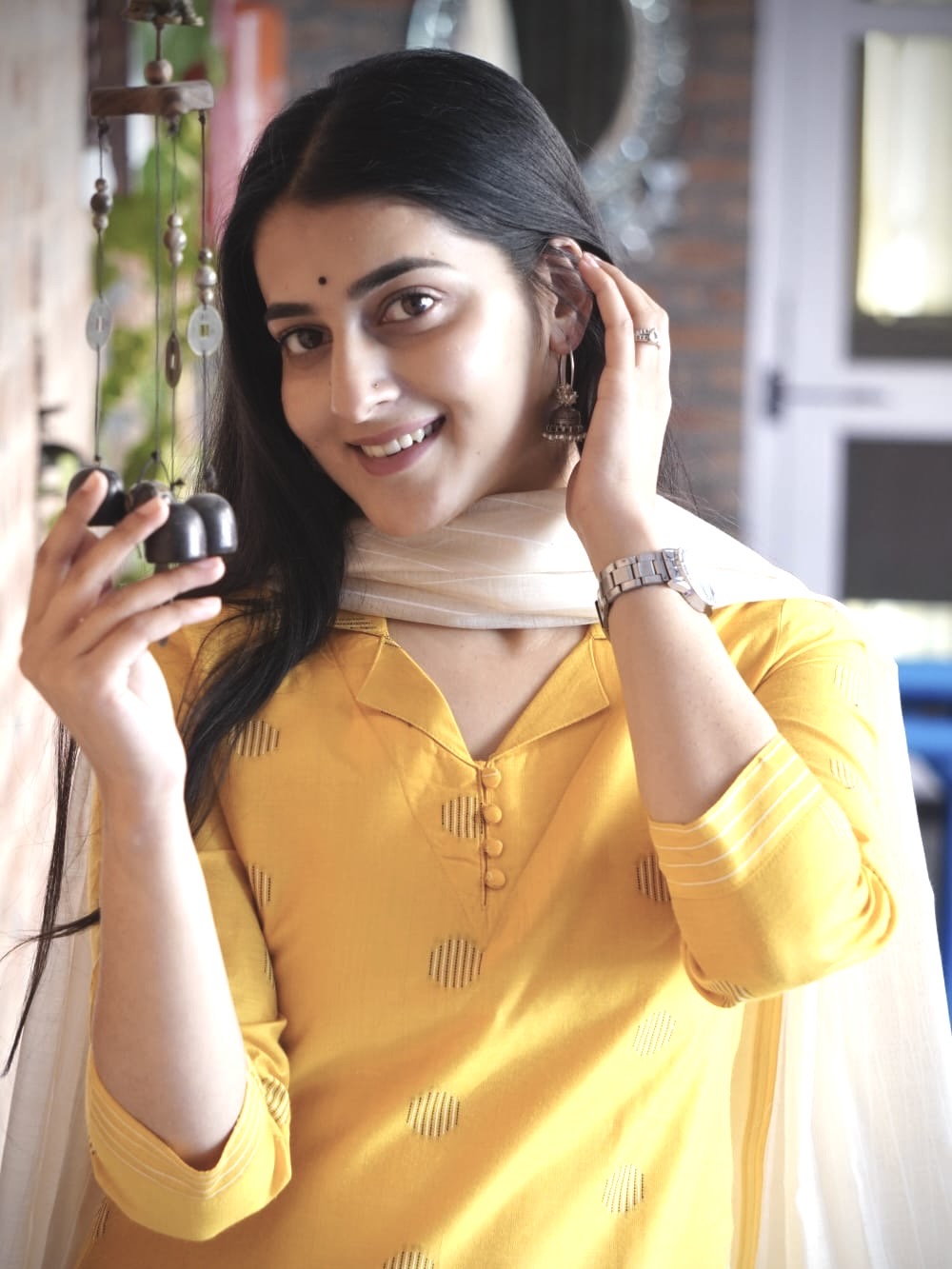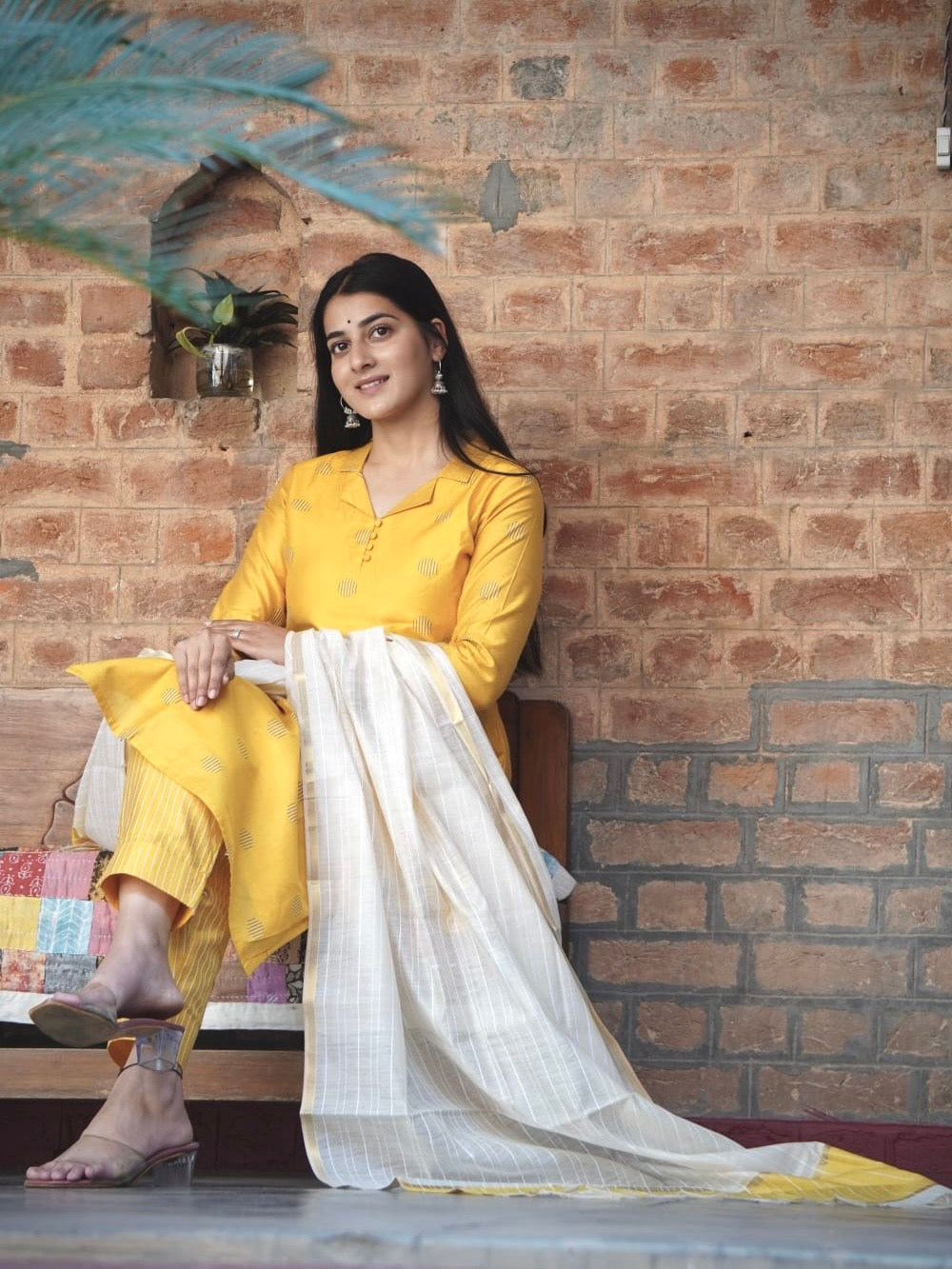 Upgrade your workwear wardrobe with the Sun & Sand Elegance Cotton Silk Kurta Set, a perfect blend of sophistication and comfort. Crafted from pure cotton-silk fabric, the kurta features a unique butti weave with soft zari threads, adding a subtle shimmer to its refined look. The collared neckline enhances its structured elegance, while the earthy chickoo and yellow tones create a timeless appeal. Paired with a matching cotton-silk dupatta, this pure cotton kurta set for women is ideal for professional settings and formal occasions.